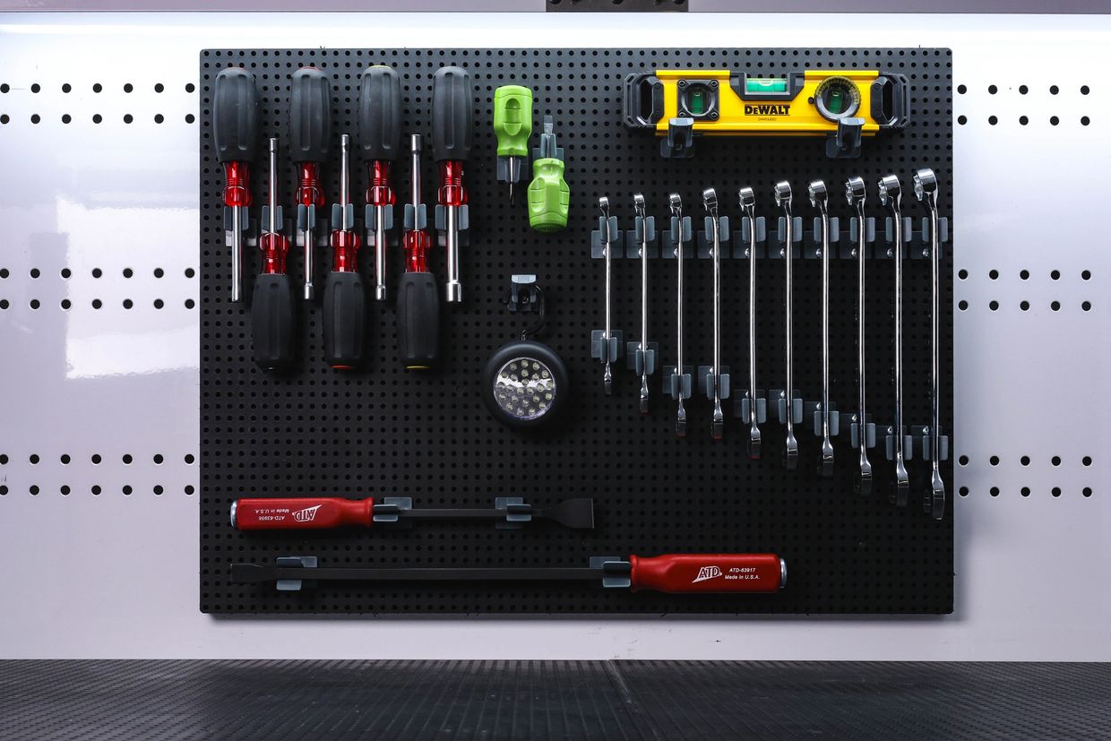 - Hooks: Small and Large – perfect for hanging pliers, hammers, large wrenches, and other hand tools.
